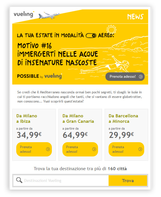 L’identità visiva di un brand, spesso, passa per font proprietari o loghi che di standard o web safe non hanno proprio nulla. Può essere importante mantenere questi tratti distintivi nelle email, e allora la soluzione è semplice: utilizza font standard per i blocchi di testo, e inserisci il font non standard nelle immagini, come sceglie di fare Vueling.