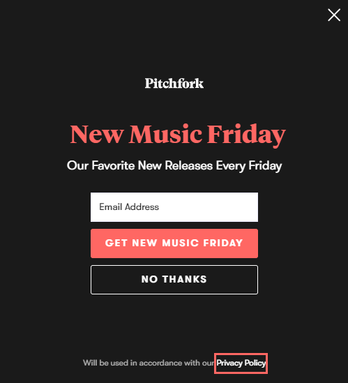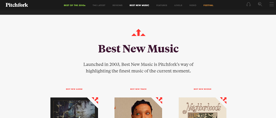 Vediamo un buon esempio di brand consistency da Pitchfork. Questa è la pagina del sito: