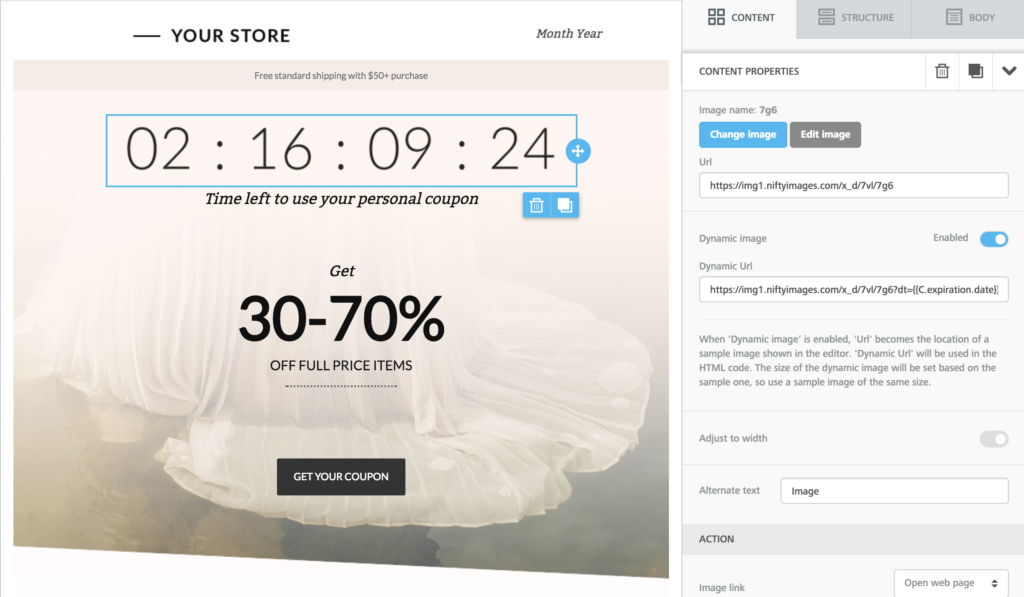In questo caso, viene passata all’interno della URL dinamica una data, ad esempio l’apertura di un nuovo punto vendita, oppure l’inizio o la fine di una promozione. Il servizio esterno genererà automaticamente un conto alla rovescia sotto forma di GIF animata.