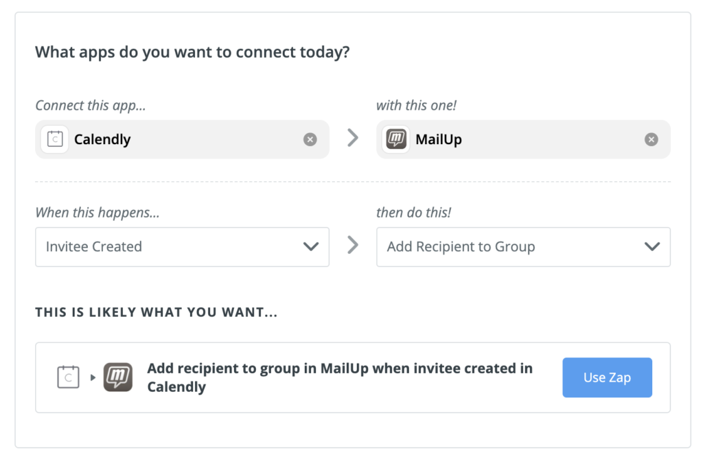 Qui però tiparliamo in particolare della capacità di Zapier di connettere Calendly e MailUp, nel giro di pochi minuti e senzadover scrivere nemmeno una riga di codice. L’integrazione ti consente digestire la comunicazione relativa a eventi e appuntamenti.