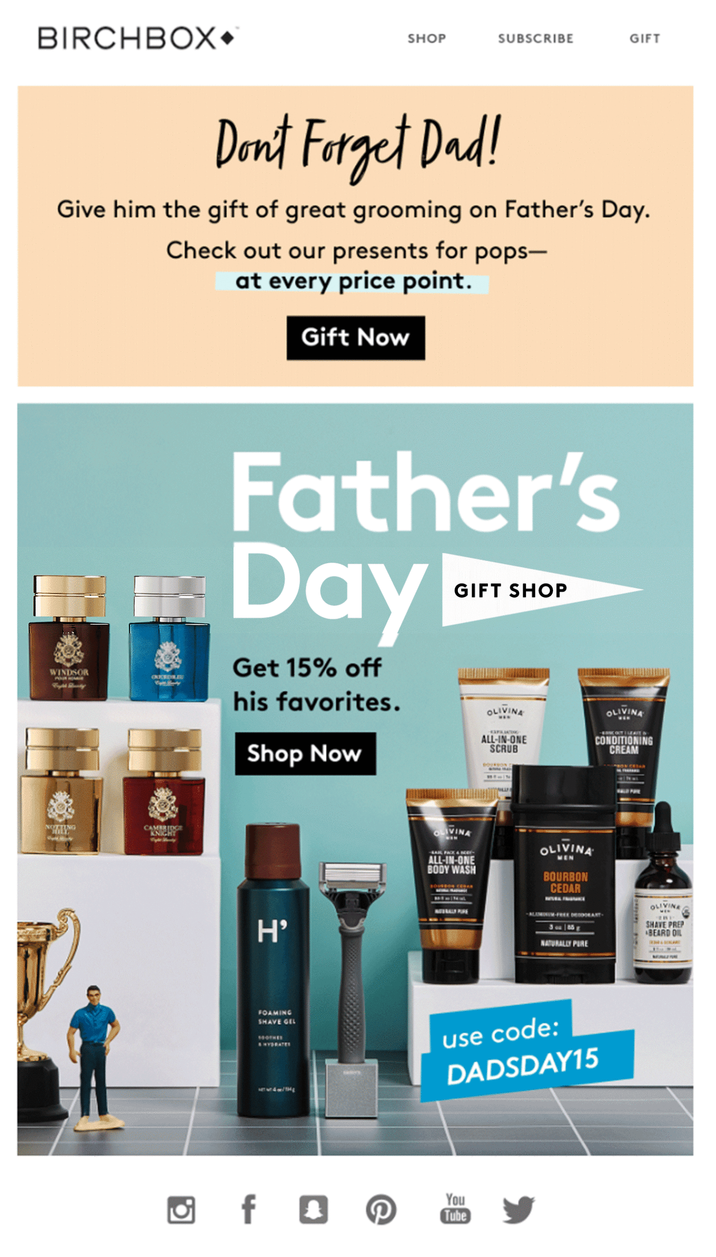 È uno dei pilastri nell’utilizzo delle GIF animate: è utile che accompagnino l’occhio e l’utente verso l’azione indicata dalla call-to-action. Bene quindi utilizzarle per sottolineare, cromaticamente o con il movimento, il punto clou dell’email, dove attirare tutta l’attenzione. Lo fa bene Birchbox, enfatizzando l’etichetta Gift Shop che costituisce il cuore del messaggio.
