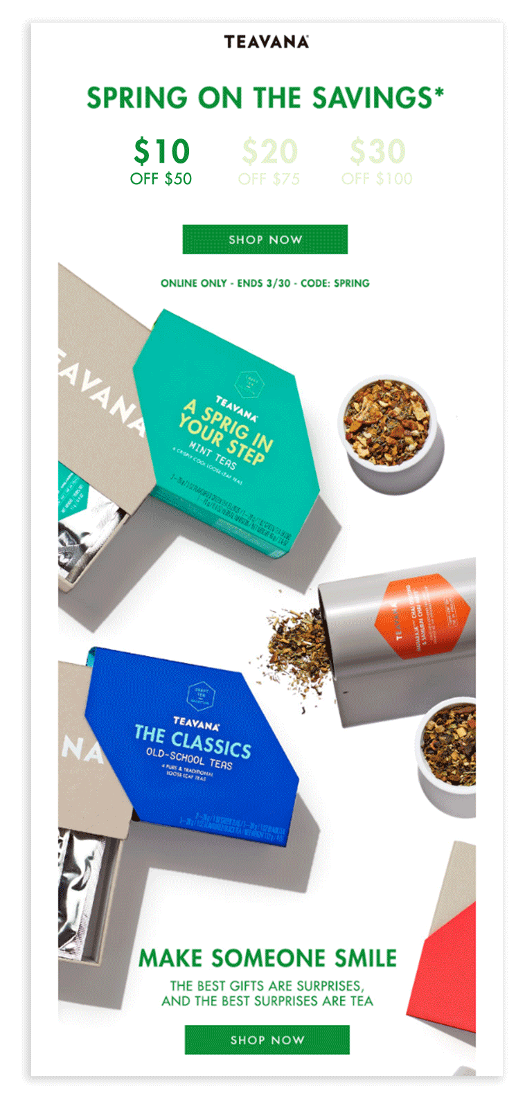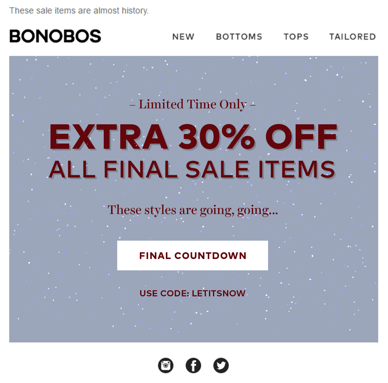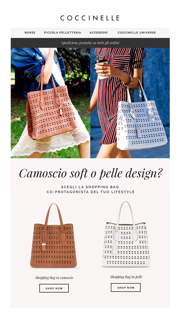 Sconti, sconti, sconti! Come assicurarsi che il messaggio non vada perso tra gli altri elementi grafici dell’email? Utilizzando l’equivalente digitale del neon intermittente dei negozi offline: una GIF animata colorata e impossibile da ignorare. L’elemento di movimento cattura l’attenzione, rendendo efficace anche un testo di dimensioni contenute.