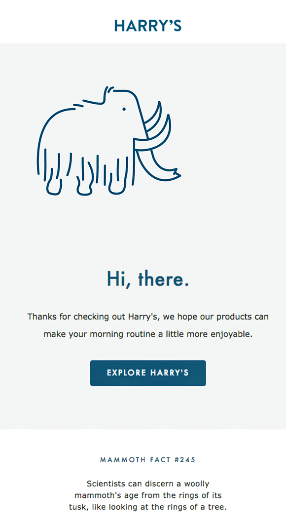 Dell’importanza di una welcome series ben fatta abbiamo già discusso. Perché accontentarsi di una banale email che dica “Registrazione avvenuta con successo”, quando puoi cominciare a costruire un vero rapporto con l’utente? Noi adoriamo questa email di benvenuto di Harry’s, che sa senza dubbio come farsi ricordare. Qui la GIF animata non ha un valore descrittivo o pratico: serve a far sorridere e a imprimere il brand nella mente del lettore.