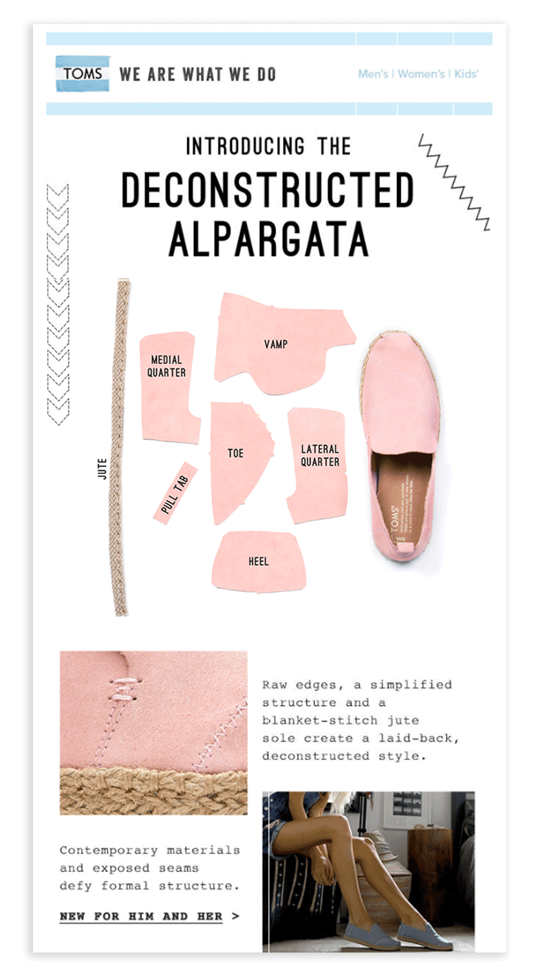 È il mantra del marketing di oggi: raccontare storie sul prodotto, fare storytelling, donare una dimensione in più rispetto alla “vetrina” con descrizione e prezzo. Ecco che le GIF animate possono venire utilmente in aiuto. Toms le utilizza per mostrare le parti che costituiscono un’apparentemente semplice mocassino, raggiungendo più scopi allo stesso tempo.