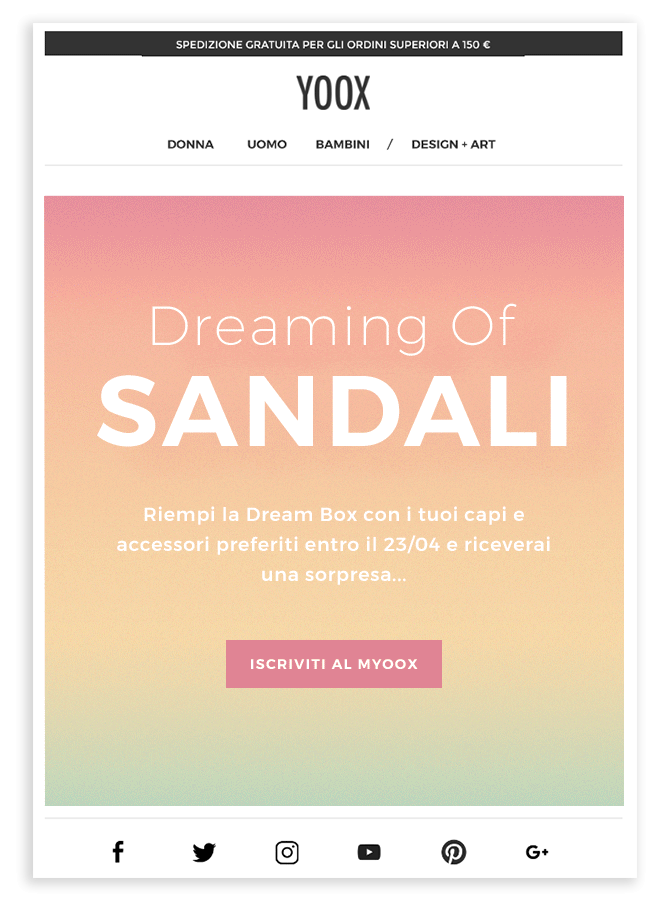 Una GIF animata è estremamente efficace anche per dare una diversa dignità a una semplice email testuale, che risulterebbe altrimenti banale o piatta. Basta un gioco come questo di seguito di Yoox, oppure un effetto di animazioni di parole che si compongono, o che cambiano colore. Spazio all’immaginazione!