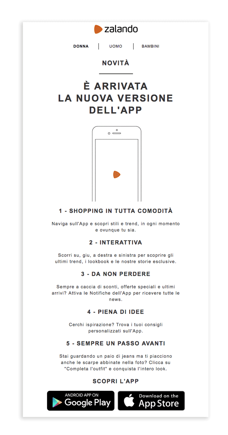 Nuova app? Nuovo sito? Perché non far provare l’esperienza di navigazione attraverso una GIF animata? Lo fa ad esempio Zalando nell’email di lancio della nuova versione dell’applicazione mobile. Un modo semplice per dare un’idea tangibile del funzionamento e della UX, invitando al download.