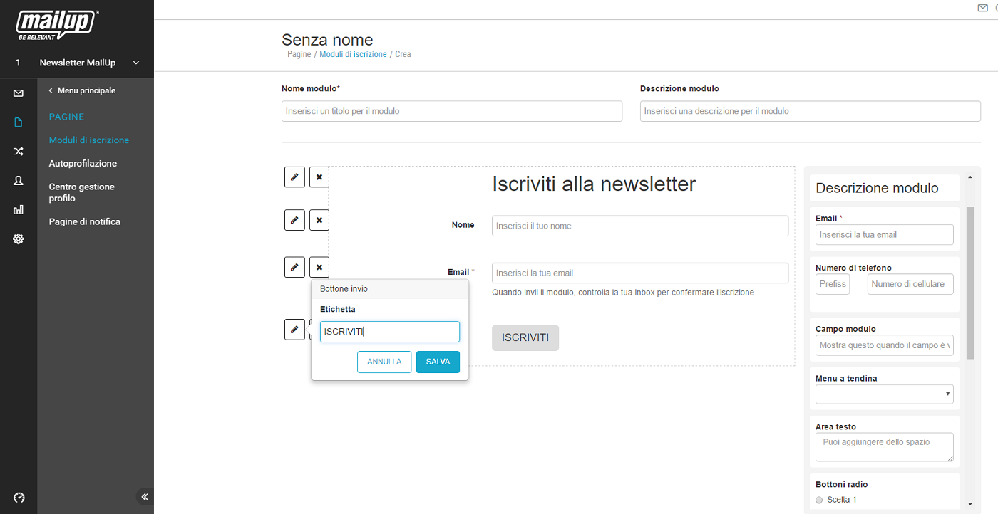 - selezionare Nuovo modulo e, con l’editor drag & drop, definire il modulo di iscrizione alla newsletter inserendo i campi necessari alla registrazione dei visitatori;