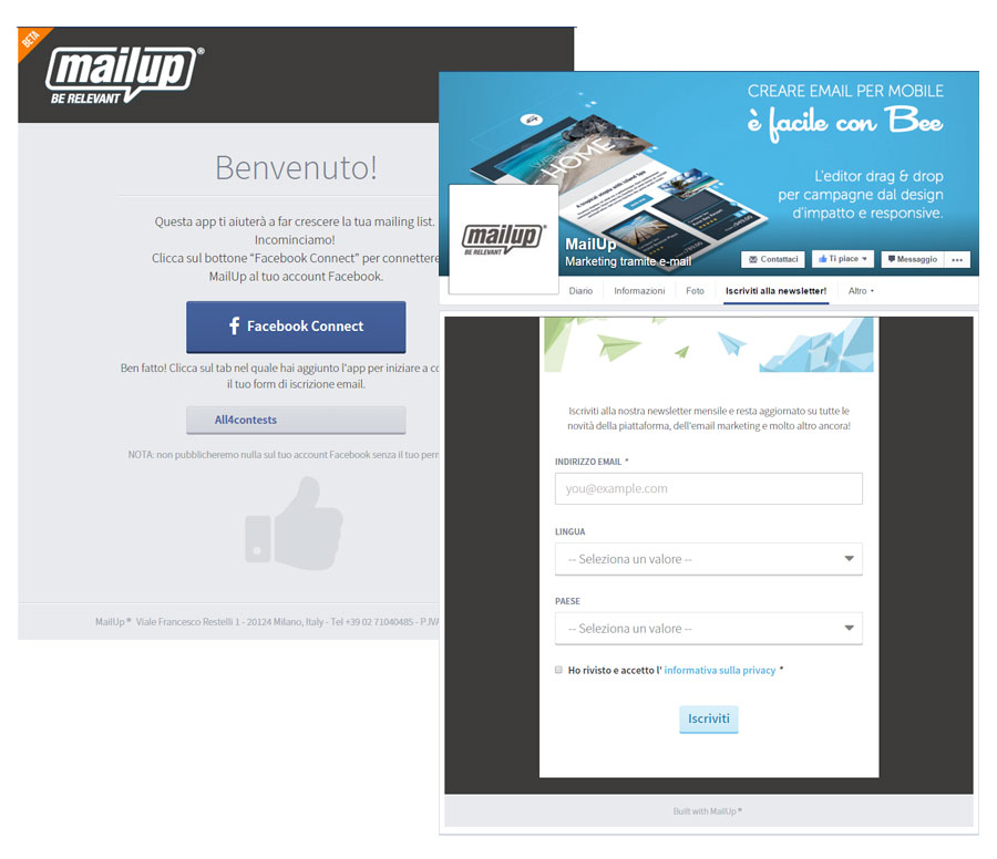 Con la Facebook app di MailUp puoi aggiungere un modulo d’iscrizione alla tua pagina Facebook, selezionare quali campi mostrare all’interno del modulo, scegliere la lista della piattaforma a cui indirizzare i nuovi iscritti e personalizzare il modulo aggiungendo un colore di sfondo e un’immagine di testata, o il tuo logo.