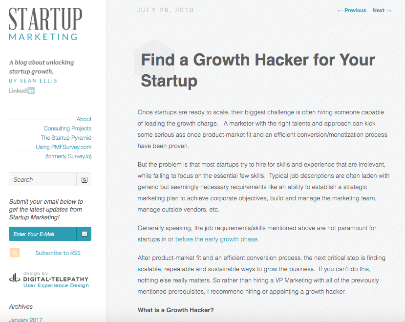 Questo lo spinse a pubblicare un annuncio di lavoro: “Find a Growth Hacker for your startup“ (Trova un Growth Hacker per la tua startup).