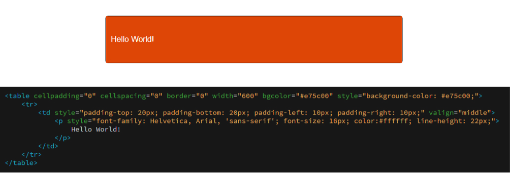 - Infine applica uno sfondo di colore arancione (background-color: #e75c00) alla cella che contiene la scritta Hello World!