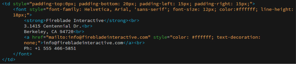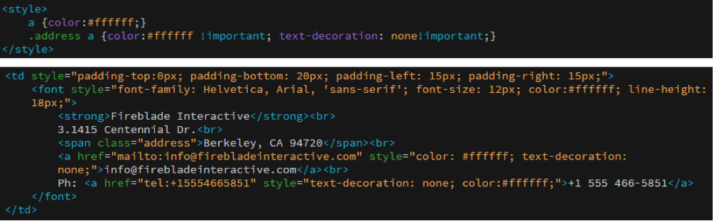 Per l’indirizzo o la data, invece, bisogna agire diversamente: è necessario definire una classe (.address) che imponga il colore (color:#ffffff;) al tag anchor che inserirà automaticamente il client e soprattutto che elimini la sottolineatura di default di ogni link (text-decoration:none;).