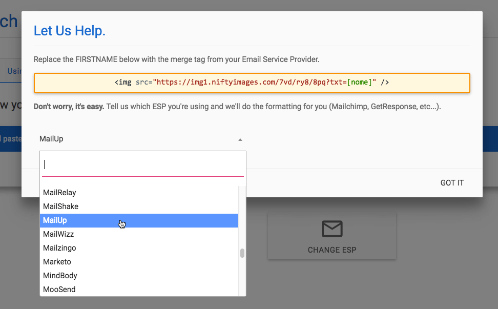 Questo passaggio è di estrema importanza: se la sintassi del tag con il nome è errata, l’immagine personalizzata non funzionerà! Ogni ESP ha una sua sintassi specifica (che prevede, ad esempio, parentesi tonde o graffe). Il menu a tendina di NiftyImages genera un URL specifica per l’ESP selezionato.