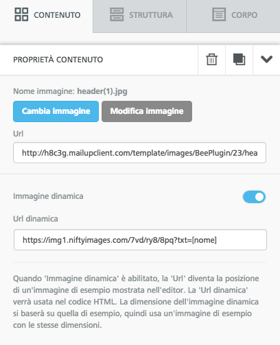 La struttura, a questo punto, è pressoché completa. A questo punto ci spostiamo su NiftyImages per creare l’immagine dinamica personalizzata e la carichiamo nel blocco immagine dell’editor BEE di MailUp.