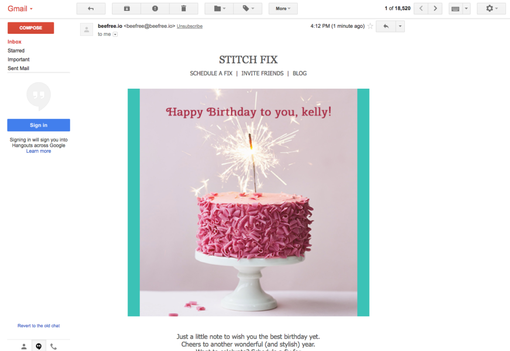Prendiamo come esempio questa email di buon compleanno inviata da StitchFix. Sappiamo che il compleanno offre un’ottima opportunità per creare una relazione personale con ciascun destinatario, che sarà contento di sentirsi coccolato e di ricevere un’offerta speciale per l’occasione.