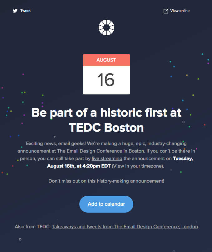Utilizzando il riquadro già presente nel modello, aggiungi l’immagine del calendario semplicemente trascinandola. Continua ad aggiungere i riquadri di contenuto per il logo Litmus, il testo e il pulsante CTA. Dopo aver trascinato e rilasciato ogni modulo, dai un’occhiata al layout dell’email che stai creando: