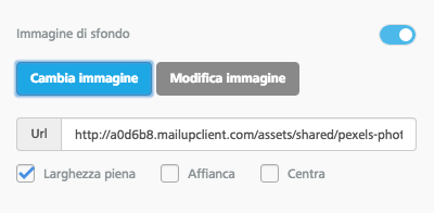 Una volta selezionata l’immagine di sfondo, puoi impostare il modo in cui viene visualizzata nell’email. Esistono tre impostazioni principali: Larghezza piena, Affianca e Centra.
