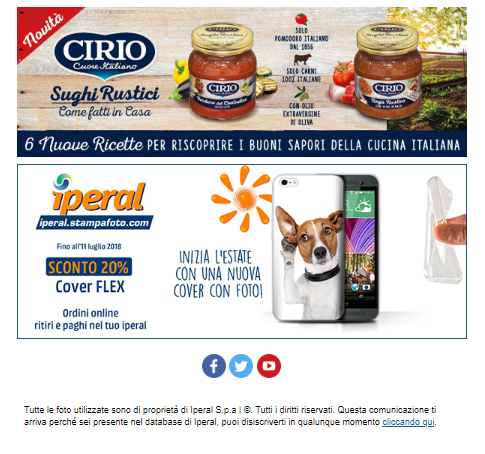 Per darti un esempio di come Iperal diversifica strategie e tecniche all’interno di un messaggio, abbiamo preso una newsletter e l’abbiamo scomposta in parti, dall’header fino al footer:
