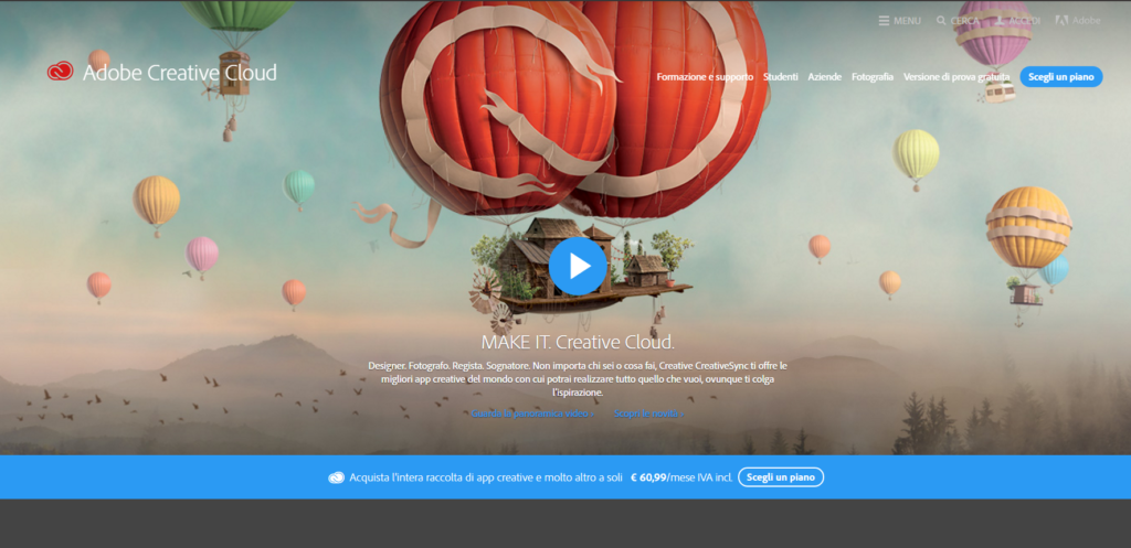 L’identità visiva di una landing page è importantissima. Deve essere coerente con il messaggio e legata sia alla tua brand identity che al profilo di utente che vuoi attirare. La landing page di Adobe Creative Cloud, qui sotto, si rivolge ai creativi: lo stile è grafico, emozionale, artistico, con un video embeddato nella pagina. Puoi utilizzare il video (ormai semplicissimo da aggiungere alle pagine grazie al linguaggio HTML5) anche per riportare dimostrazioni di prodotto o testimonianze di clienti.