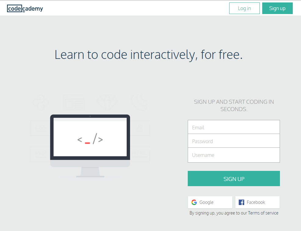 Dall’altra parte, può anche darsi che per te – ipotetico servizio B2B dedicato ai professionisti della contabilità – una landing page pulita e sui toni del bianco funzioni meglio. O che, in caso di vendita di software, una hero image di un computer con screenshot del servizio sia la scelta migliore, come fa Codeacademy. Si tratta solo di provare!