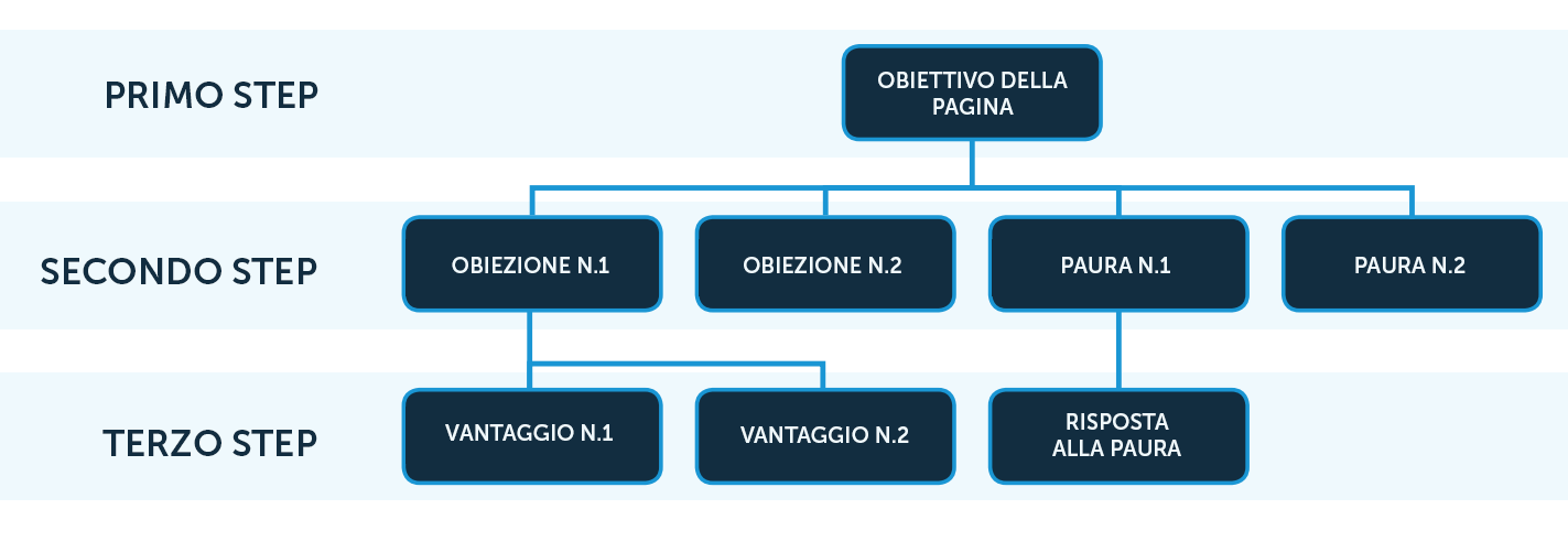 Dalla definizione dell’obiettivo dipendono le decisioni successive: come spiegato nello schema qui sotto, procedi con l’individuazione delle obiezioni e delle paure dell’utente che possono frenarlo dal completare l’obiettivo e inserisci nella landing page elementi che prevengano o risolvano tali pain point.