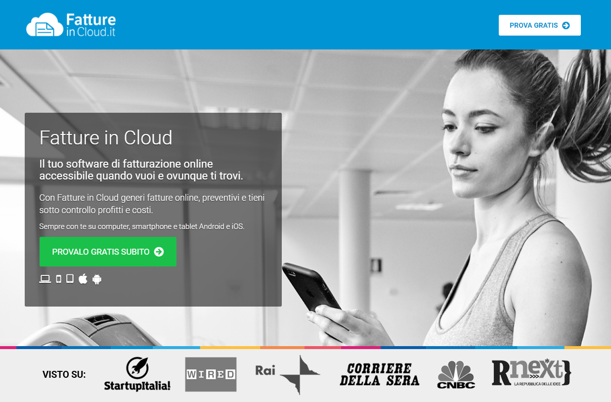 Anche citare testimonial, tweet di apprezzamento e opinioni di clienti reali aiuta moltissimo. Fatture in Cloud, qui sotto, utilizza come elemento di trust le testate giornalistiche che hanno parlato del servizio.