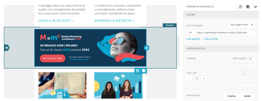 In questo modo gli elementi con attiva l’opzione non verranno visualizzati sui dispositivi mobile, riducendo l’estensione in verticale dell’email.