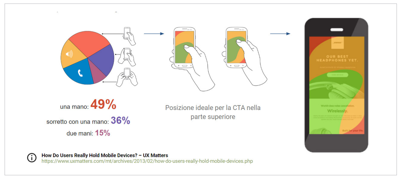 Una best practice che si basa su una precisa modalità di interazione con lo smartphone, che prevede l’utilizzo di una sola mano, e in particolare del pollice, che agisce sullo schermo mentre le altre dita sorreggono il device.