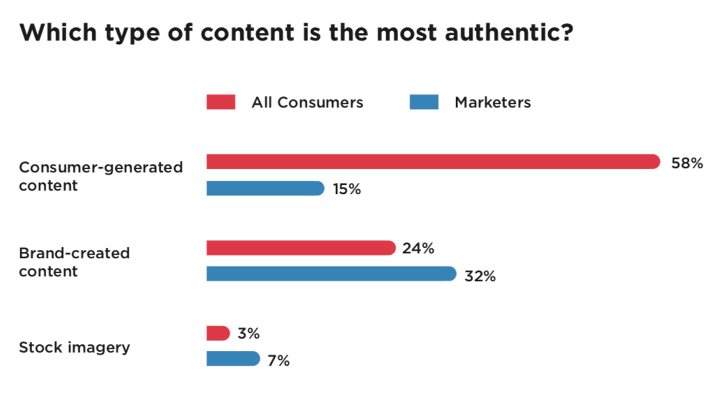 Ne emerge un quadro su cui le aziende devono riflettere: se per gli utenti gli user generated content sono contenuti più autentici rispetto ai contenuti prodotti dagli influencer, i marketer pensano che il brand-created content sia più autentico rispetto a quello prodotto dagli utenti.