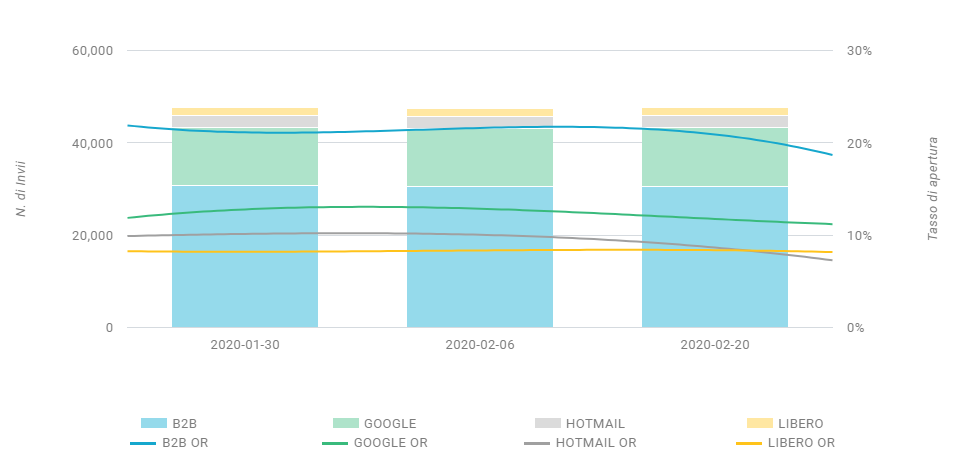 Fornisce una panoramica sullo stato disalute del database. Per ogni giorno in cui è stato effettuato almeno un invio,il grafico divide i destinatari in: