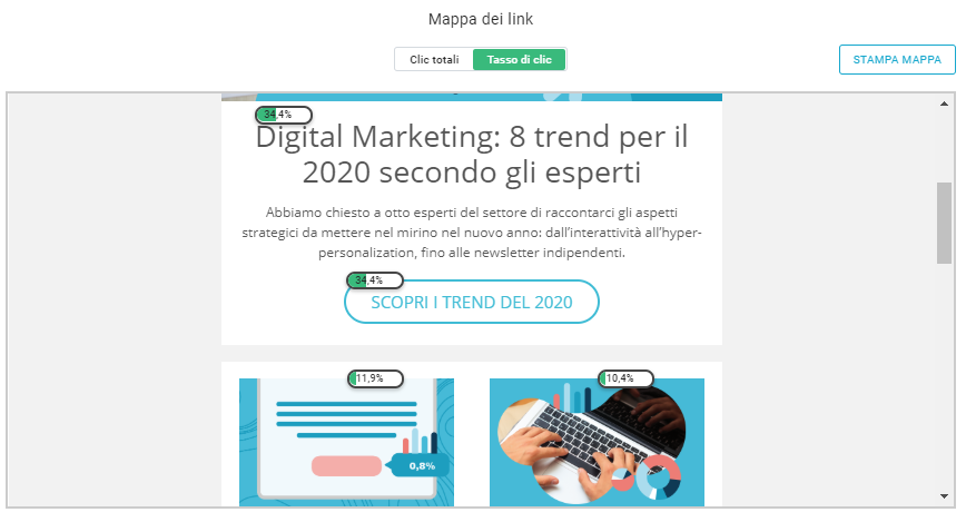 Oltre agli strumenti di tracciamento dei clic, un’utile funzione è la cosiddetta heat map, che offre uno sguardo quantitativo su come i clic si distribuiscono in un pagina o in un’email. Restituiscono cioè all’azienda quella che potremmo definire la “geografia del clic“.