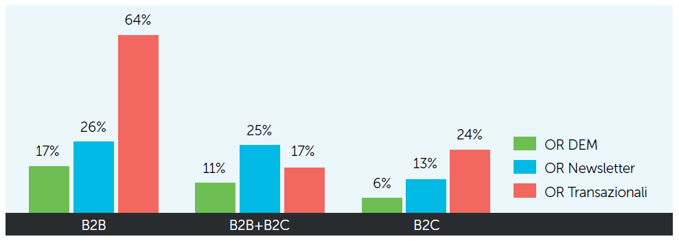 Per quanto riguarda il tipo di comunicazione, le email transazionali sono quelle che registrano i risultati migliori, grazie alla loro natura funzionale e one-to-one. Seguono le newsletter (a causa del carattere informativo, atteso ed esplicitamente richiesto del loro contenuto) e infine le DEM, che si dimostrano efficaci solo quando accompagnate da un’attenta strategia di profilazione e di segmentazione.