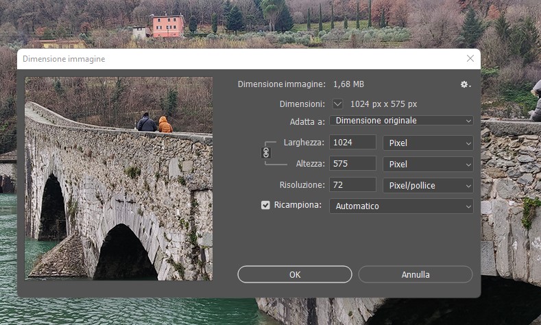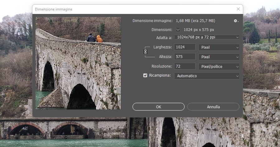 Da questa posizione è possibile effettuare un primo adattamento sia indicando manualmente le nuove dimensioni, ad esempio dagli originali a 4000 x 2248 px a 1024 x 768 px, che selezionandola direttamente dal menu corrispondente alla voce “Adatta a:”.