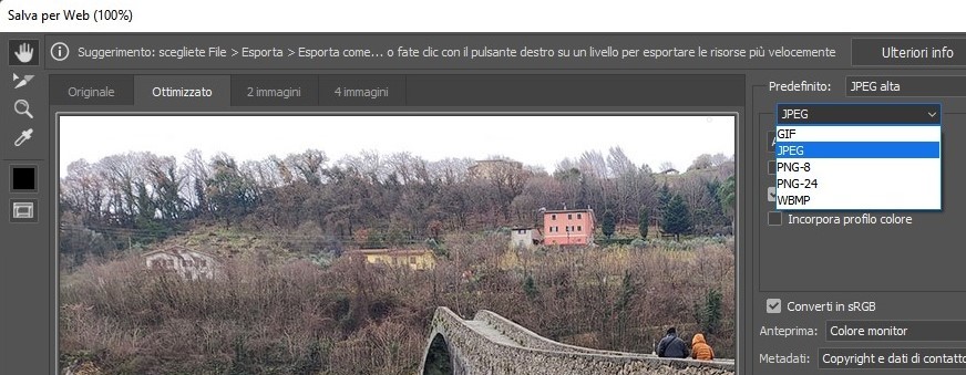 Completata la fase di ridimensionamento si può eseguire un’ulteriore procedura di ottimizzazione esportando l’immagine in un formato specifico per Internet. Ciò è possibile tramite l’opzione “Salva per Web”, accessibile dal percorso “File > Esporta”, con cui scegliere anche l’estensione dell’output (JPEG nel nostro esempio).