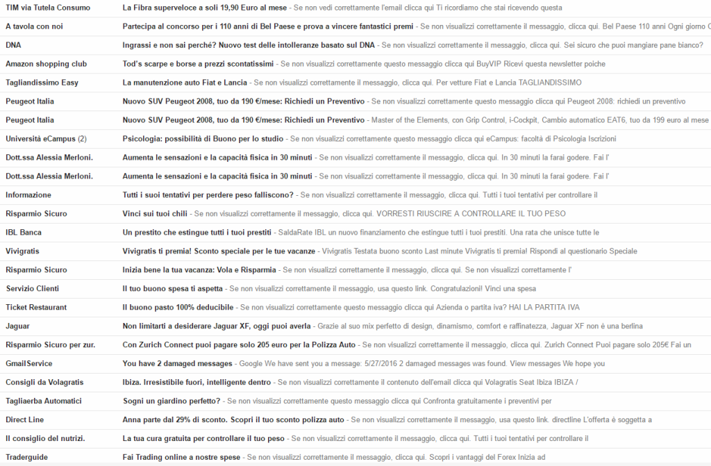Ma quanto valgono queste limitazioni al giorno d’oggi? Poco, in entrambe le direzioni. Così come l’inserimento di parole pericolose non condanna automaticamente a finire in posta indesiderata, così un oggetto composto secondo le migliori linee guide non è sufficiente a garantire il recapito. Per comprendere questo meccanismo basta andare a guardare i messaggi finiti nella posta indesiderata del proprio account email. Sono davvero tutti infarciti di maiuscole ed offerte? Quello che segue è uno screenshot di come appare la cartella Spam del mio account Gmail. Alcuni subject non rispondono affatto all’identikit dello “spammoso” a cui siamo abituati a fare attenzione: segno che il provider sa riconoscere, dietro un oggetto apparentemente innocuo, altri segnali di potenziale spam.