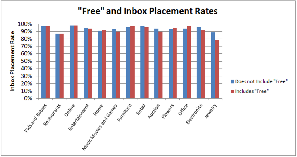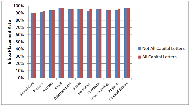 Le evidenze non finiscono qui. Alcuni studi interessanti dimostrano come in diversi settori i subject contenenti elementi ad alto rischio spam (come il termine Free o intere parole in maiuscolo) presentino, alla prova dei fatti, tassi di recapiti sostanzialmente identici alle mail con oggetto “pulito”. La riprova che le regole valgono finché non conviene romperle.