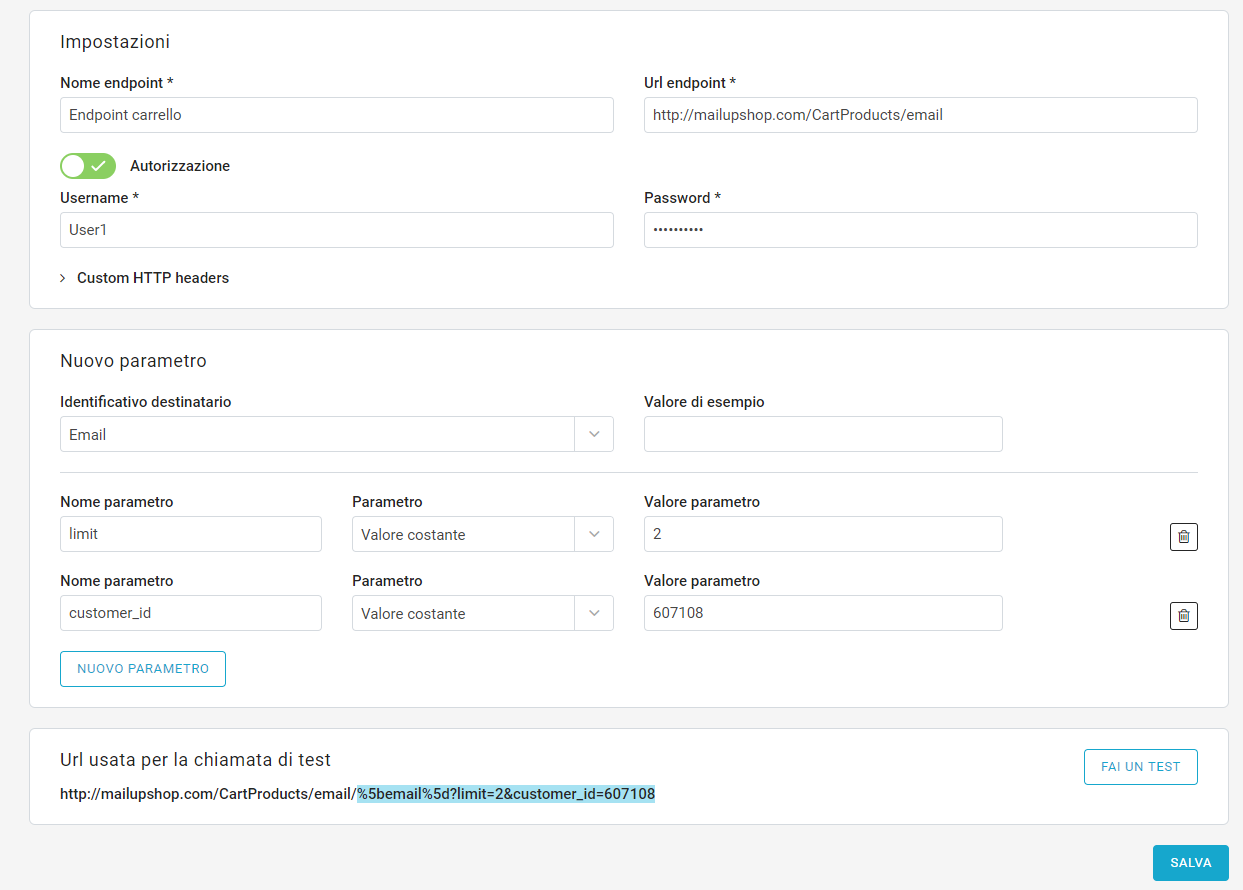 - Nuovo parametro: tramite questa sezione vengono impostati i valori che vengono passati all’endpoint (es. Customer ID, Città, Data carrello abbandonato, etc.)