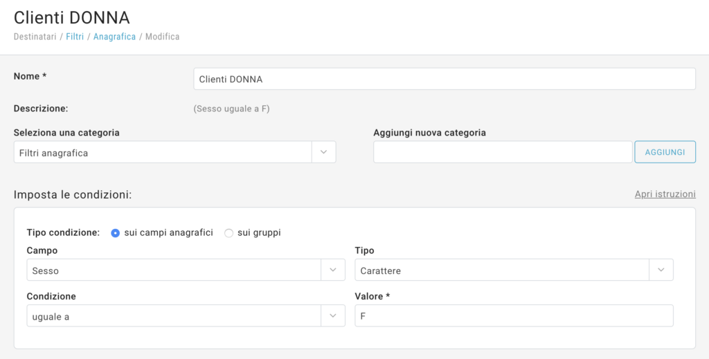 Come prima cosa è necessario creare le regole da applicare alle righe di contenuto. Per farlo ci serviamo dei Filtri (nella sezione Destinatari > Filtri) che possono essere anagrafici, per attività, geografici, per dispositivo. Per utilizzare Visualizzazione condizionale ci serviamo unicamente dei Filtri anagrafici.