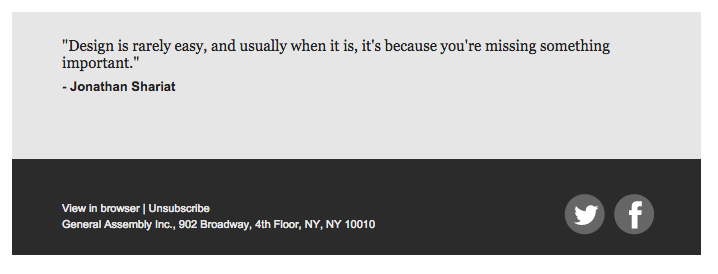 Il footer è anche uno spazio per divertirsi! Alcuni brand includono una frase di chiusura evocativa o anche divertente. General Assembly chiude le sue email con una citazione: