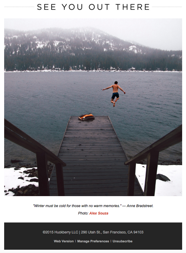 Huckberry, marchio di abbigliamento, include anche una citazione ispiratrice nel suo footer oversize, che sembra combinare gli elementi di design del footer di General Assembly e di quello di AirBNB: