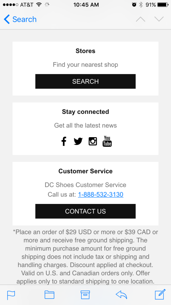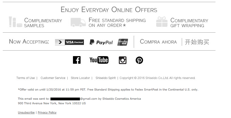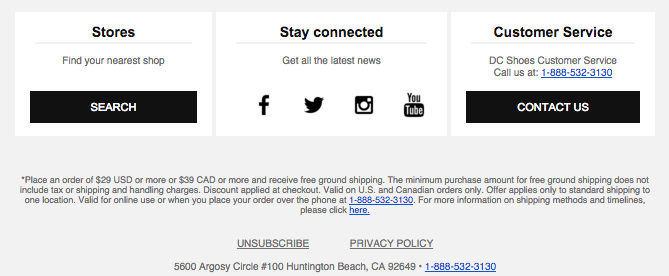 - Dettagli o restrizioni su un’offerta. I rivenditori spesso devono includere molte clausole scritte in piccolo riguardanti sconti e offerte pubblicizzate via email e il footer finisce per diventare lo spazio dove vengono collocati questi dettagli.