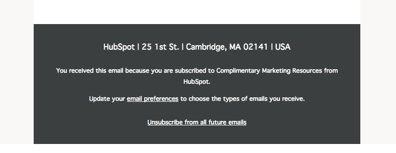 I footer si distinguono spesso dal corpo dell’email per un colore di sfondo HTML sostanzialmente diverso. Utilizzare un colore di sfondo è uno dei modi più rapidi ed efficaci per far sapere ai lettori dove termina una sezione dell’email e dove inizia la successiva. Di seguito un esempio di footer di HubSpot: