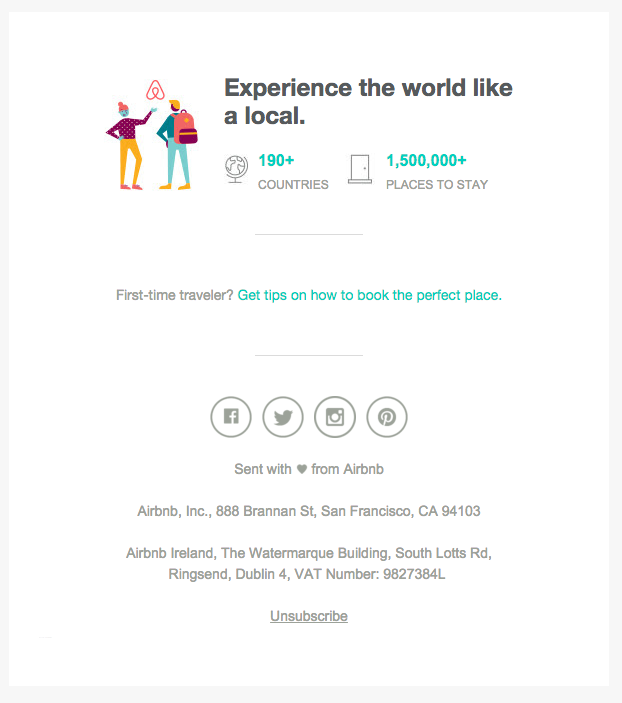 Non ci sono regole generali che indichino quanto deve essere grande o piccolo il footer. Quando progetti la tua email, vuoi essere consapevole delle dimensioni e della lunghezza del contenuto per evitare di sovraccaricare i piani dati degli iscritti o che il messaggio venga tagliato. Ma se c’è spazio per il messaggio, il footer può espandersi per diventare una parte più ampia dell’email. Ecco un esempio tratto da Airbnb, che utilizza il footer per rafforzare il proprio branding usando una tagline ed elementi grafici semplici per evidenziare dati importanti: