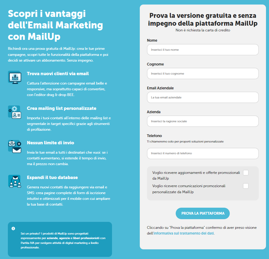 Per attivare la prova ed accedere alla piattaforma MailUp il primo step è compilare questo form, che troverai cliccando qui.