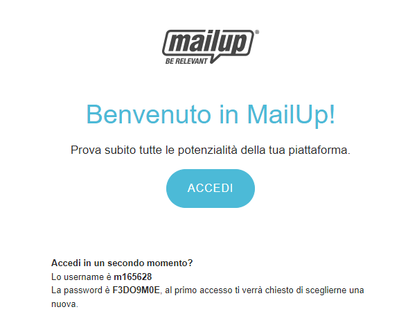 Una volta compilati i campi del form di richiesta attivazione prova, riceverai un’email di conferma attivazione con le credenziali per accedere alla tua piattaforma di prova MailUp:
