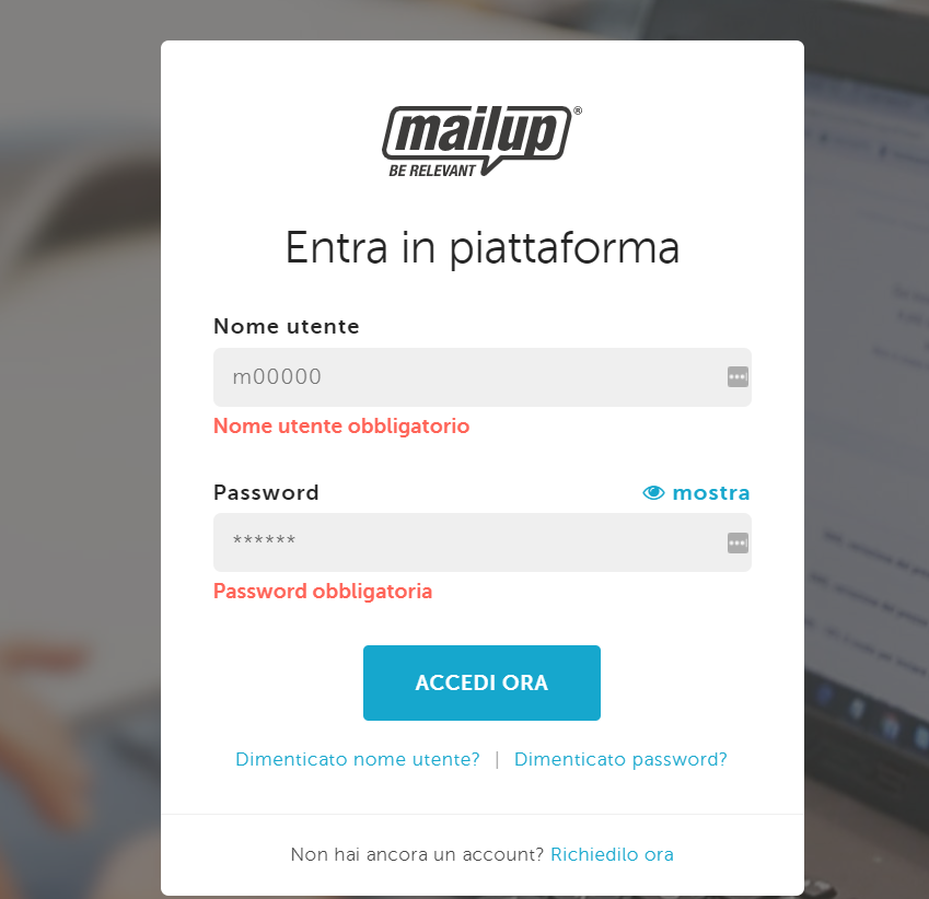 A questo punto potrai accedere alla tua piattaforma MailUp di prova. Usa lo username che ti è stato inviato e la password da te impostata ogni volta che fai il login a questo indirizzo: https://login.mailup.it/