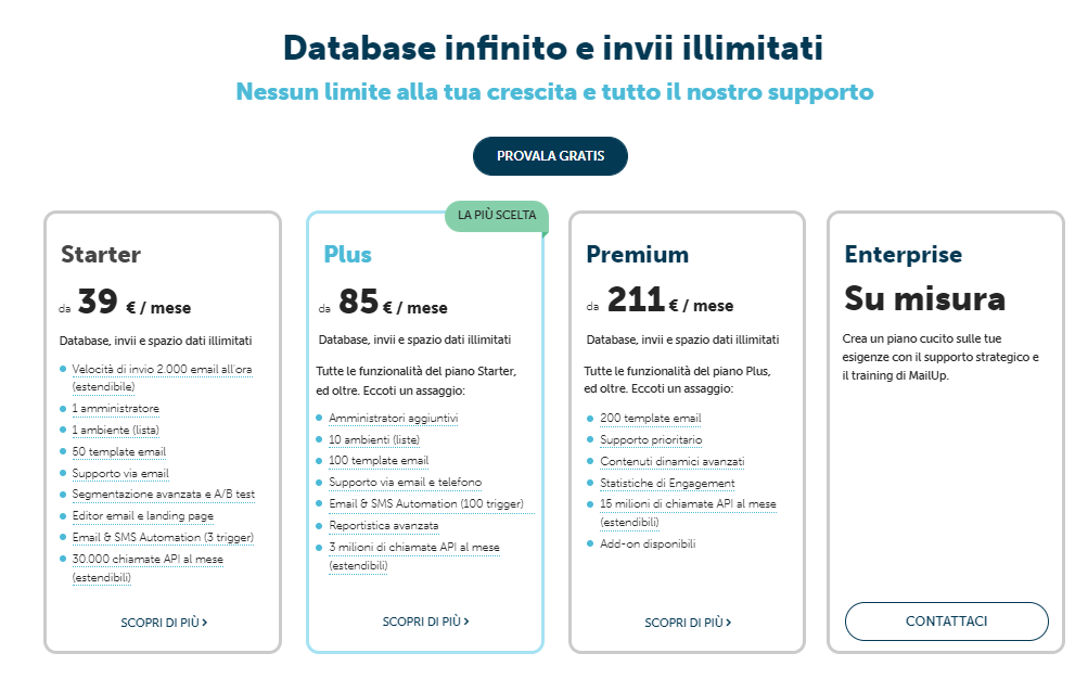 Versatili e variegati in modo da soddisfare i bisogni e le preferenze di qualsiasi azienda: questi i diversi piani a pagamento di MailUp