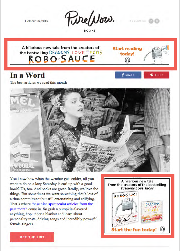 Questo trend discendente non implica che i banner non continuino a essere uno dei formati pubblicitari più utilizzati anche nelle email. Ecco come li utilizza – in apertura e all’interno del corpo del messaggio – PureWow.