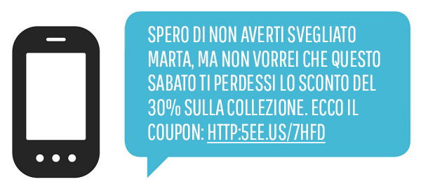 Se hai una grande promozione per il fine settimana, è consigliabile inviare non troppo presto (l’SMS suonerà come stonato e inopportuno) né troppo tardi (il tuo contenuto dovrà competere col programma già definito per il week end). Il giovedì può essere il giorno giusto: darai loro abbastanza tempo per pianificare il weekend e la visita al negozio. Per rinforzare il contatto, è consigliabile inviare un ulteriore SMS la mattina dell’evento/promozione, rispettando sempre il termine post quem delle 10. La tua campagna sarà ancora più efficace se all’interno inserirai un coupon di sconto speciale o un’offerta gratuita. L’SMS potrebbe suonare così: