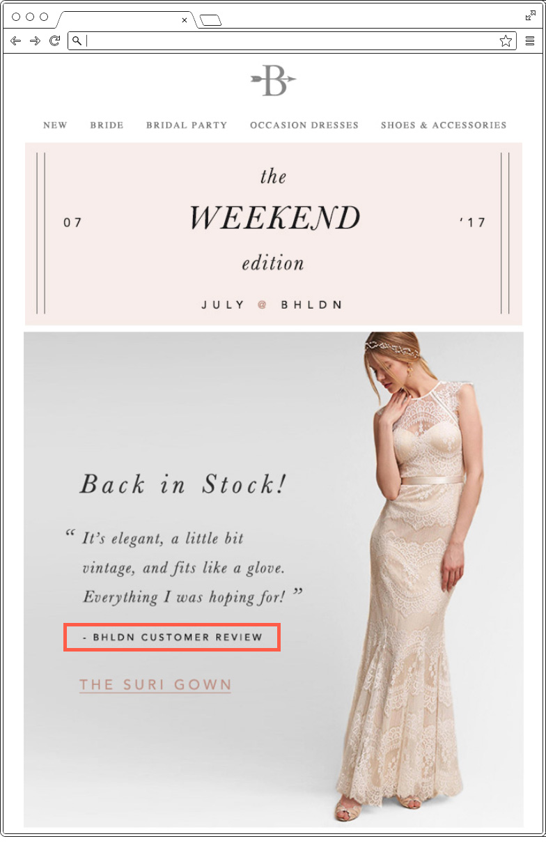 Più è percepita come vicina la persona che lascia la recensione email, più è alta l’identificazione che viene generata. Puoi benissimo inserire recensioni anonime, come fa BHLDN…