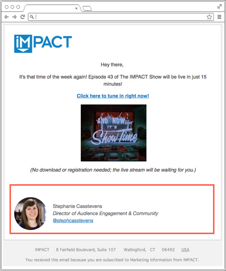 - Una semplice foto insieme alla firma, anche nelle email massive (come fa Impact qui sotto)